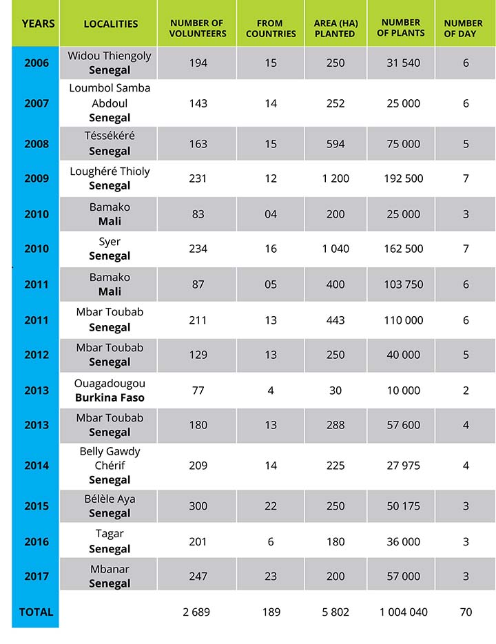 Les efforts généreux et désintéressés des nombreux bénévoles ont été très productifs, même s'ils ont été limités dans le temps. Sur une période de 12 ans, nos bénévoles ont planté plus de 5 800 ha de terrain pendant une période moyenne de 5 jours. Chaque campagne de reboisement a apporté des avantages immédiats et tangibles pour la population locale. Chaque lot, après avoir été clôturé pour permettre la bonne croissance des plantes, devient un réservoir d'herbe que la population locale, composée principalement d'éleveurs, peut récolter pour nourrir ses troupeaux.